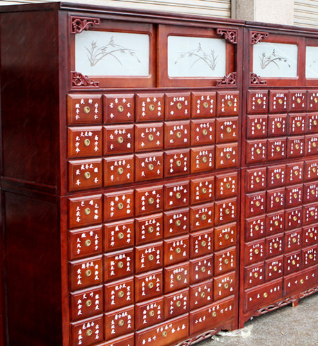 由(yóu)於藥櫃上下左右七排鬥(不包括底層的三個四格(gé)抽屜),故又稱七星鬥(dòu)櫃。因其調劑藥品,方便易(yì)取,找藥容易,故又有"抬(tái)手取,低頭拿,半步可觀全藥匣"的特點(diǎn)。鬥麵呈長方形(左右寬20厘米,上下(xià)高15厘米),稍微高出櫃麵(0.2~0.3厘米),四(sì)邊倒棱(léng),加之醒(xǐng)目規律的黑色隸書藥名(míng),使整體鬥櫃表麵布局層次分明,雅致美觀(guān),白色潔淨,紫紅古樸,為曆代名家的好選擇。